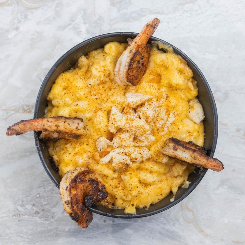 Oohh’s & aahh’s award-winning four cheese mac & cheese, creamy seafood sauce, and jumbo lump crab meat melted together and topped with four extra-large blackened shrimp.